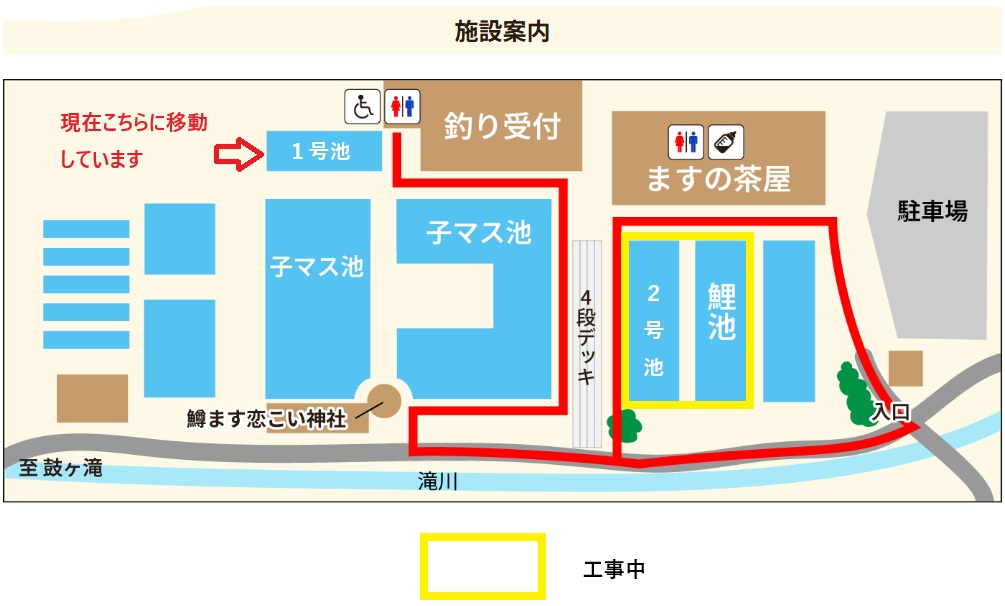1月下旬から2月にかけて鯉池と2号池の修繕工事を行います。それに伴って鯉池のコイとチョウザメを釣り竿カウンター横の1号池に移動させています。エサやり体験は工事が完了するまでは引き続き1号池でお楽しみいただけますのでどうぞよろしくお願いいたします。