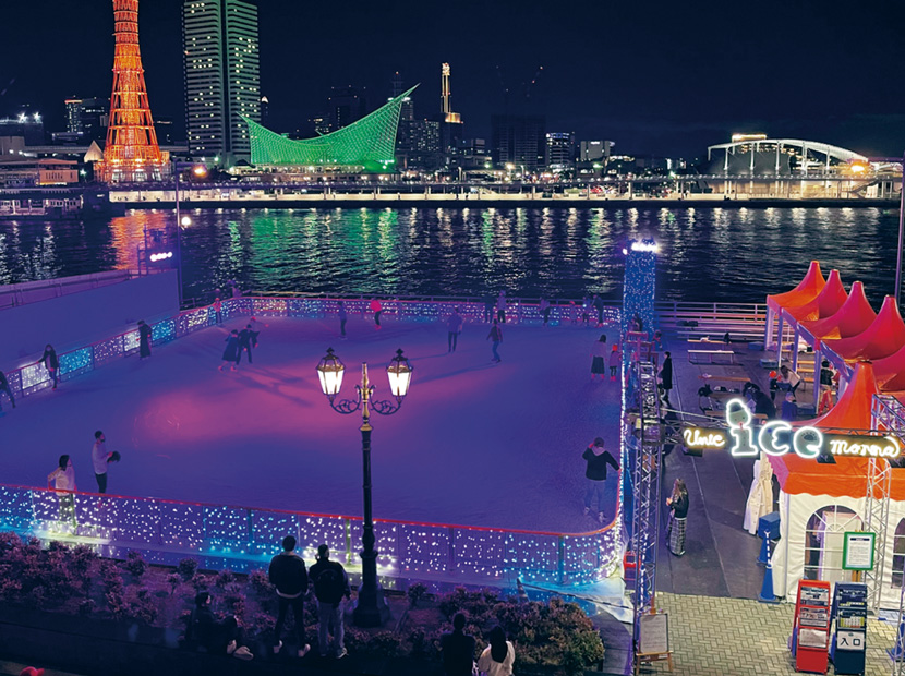 本物の氷を使った屋外にあるアイススケートリンク。神戸の絶景を眺めながらスケートができます(2025年2月11日(火・祝)まで開催)。日没後は神戸港やスケートリンクがライトアップされ、ロマンチックで幻想的な夜景が広がります。