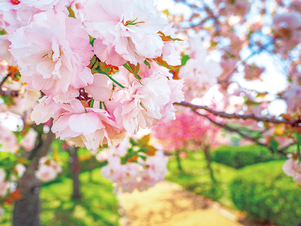日本庭園のある「梁瀬苑(やなせえん)」から加古川沿いに約850メートルほど続く桜並木。35種類260本もの八重桜が小道を美しく彩ります。春のあたたかな陽気と桜の花びらに包まれる幻想的な小道を歩くと、まるで夢をみているような気分になります。