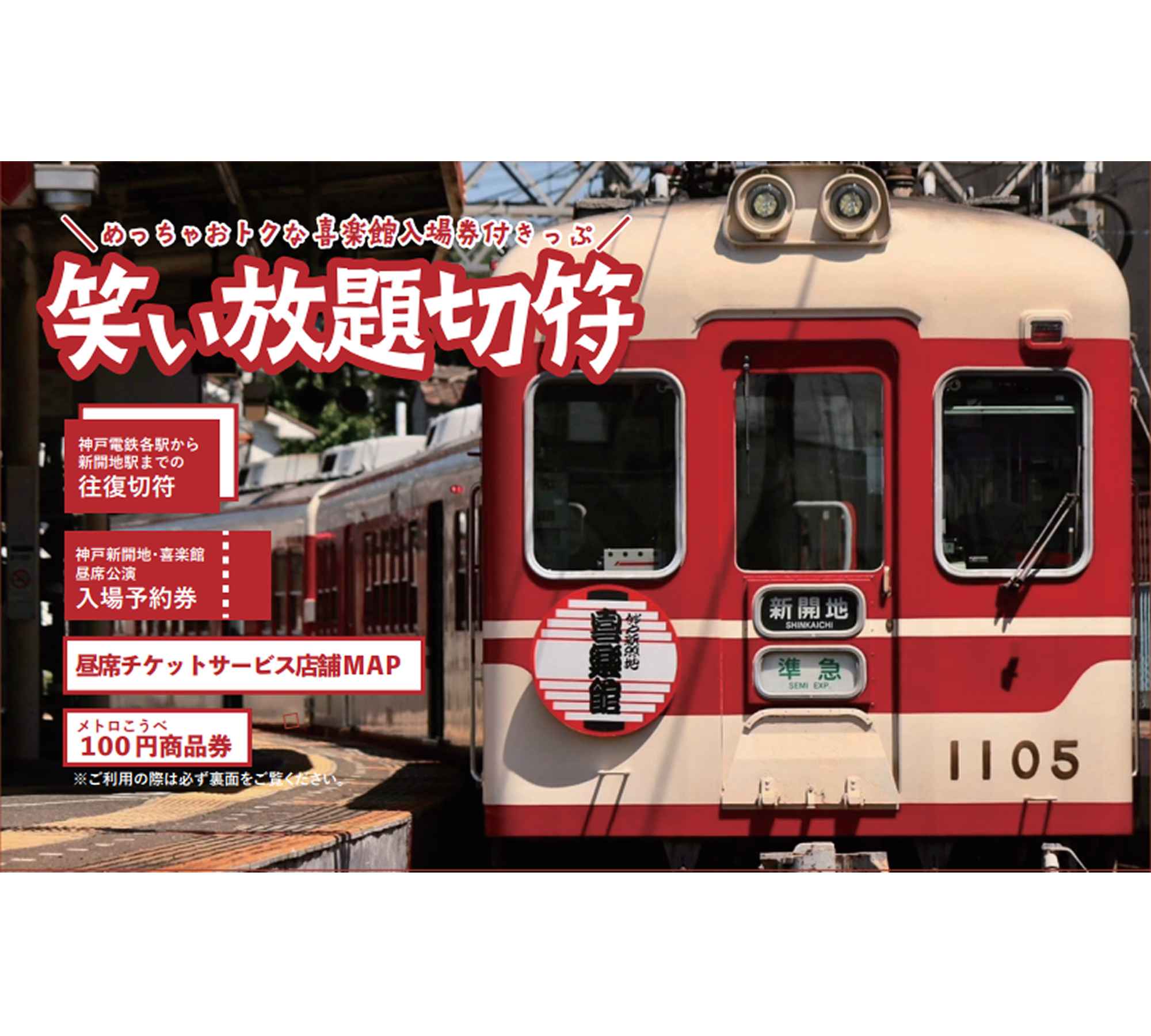 神鉄各駅から新開地駅までの往復乗車券と「喜楽館・昼席公演入場予約券」(前日までの予約が必要)と昼席チケットサービス店舗MAP(割引サービス店舗一覧)やメトロ こうべの指定店舗で利用可能な金券(100円分)をセットにしたお得な乗車券!〔発売枚数限定〕