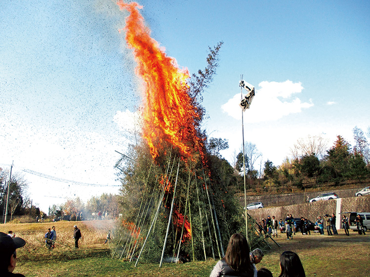 持ち寄ったお正月飾りやしめ縄、書き初めを焚き上げ「無病息災でいい1年になりますように」と願う伝統行事を行います。ふるまいとして温かい豚汁