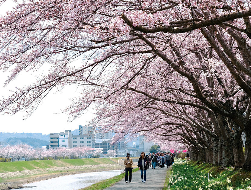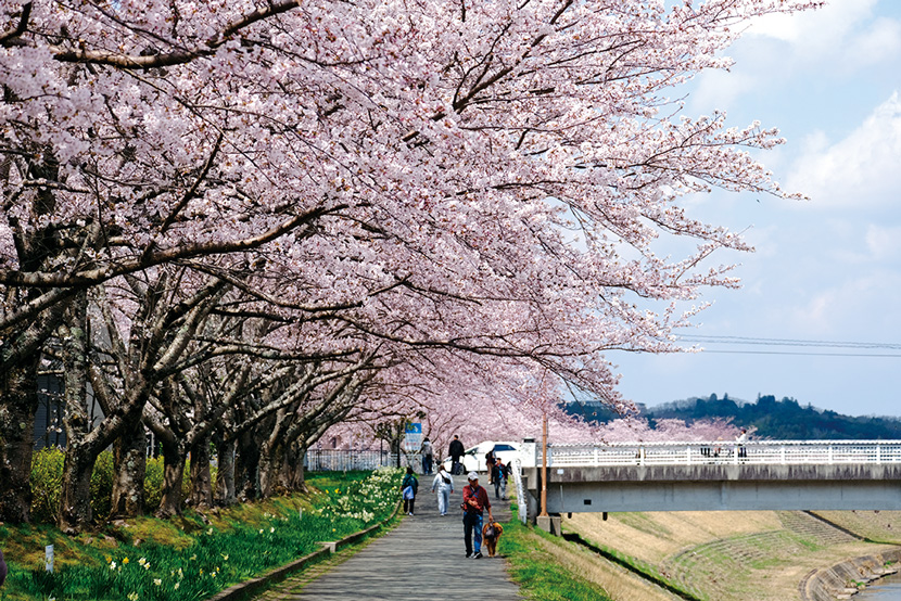 三田市内を流れる武庫川沿いに、約4,000本の桜並木が続く関西屈指の桜スポット。1991年から整備が進められた瀬戸内海と日本海を結ぶ、総延長約170㎞の「ふるさと桜づつみ回廊」の一部でもあります。川と桜に囲まれた小道は、春の散策にぴったり。桜が満開になると、お花見を楽しむ人々で近くの芝生広場が賑わいます。