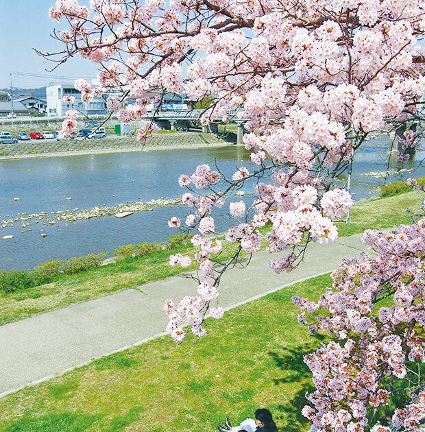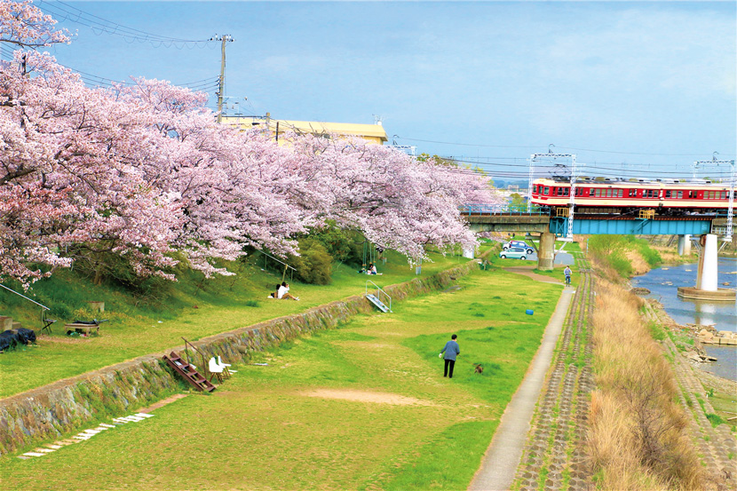 三木市の中心を流れる美嚢川沿いに続く桜並木は、毎年多くの人が訪れるお花見の名所。土手沿いの桜が見頃を迎えると、ピクニックを楽しむ人の姿が見られます。また鉄橋を走る神鉄と桜を一緒に眺められることから、鉄道ファンにも人気。この季節ならではの景色を写真に収めてみては。